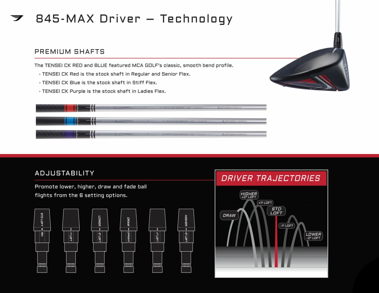 - Adjustable with 6 setting options to promote lower, higher, draw and fade ball flights
