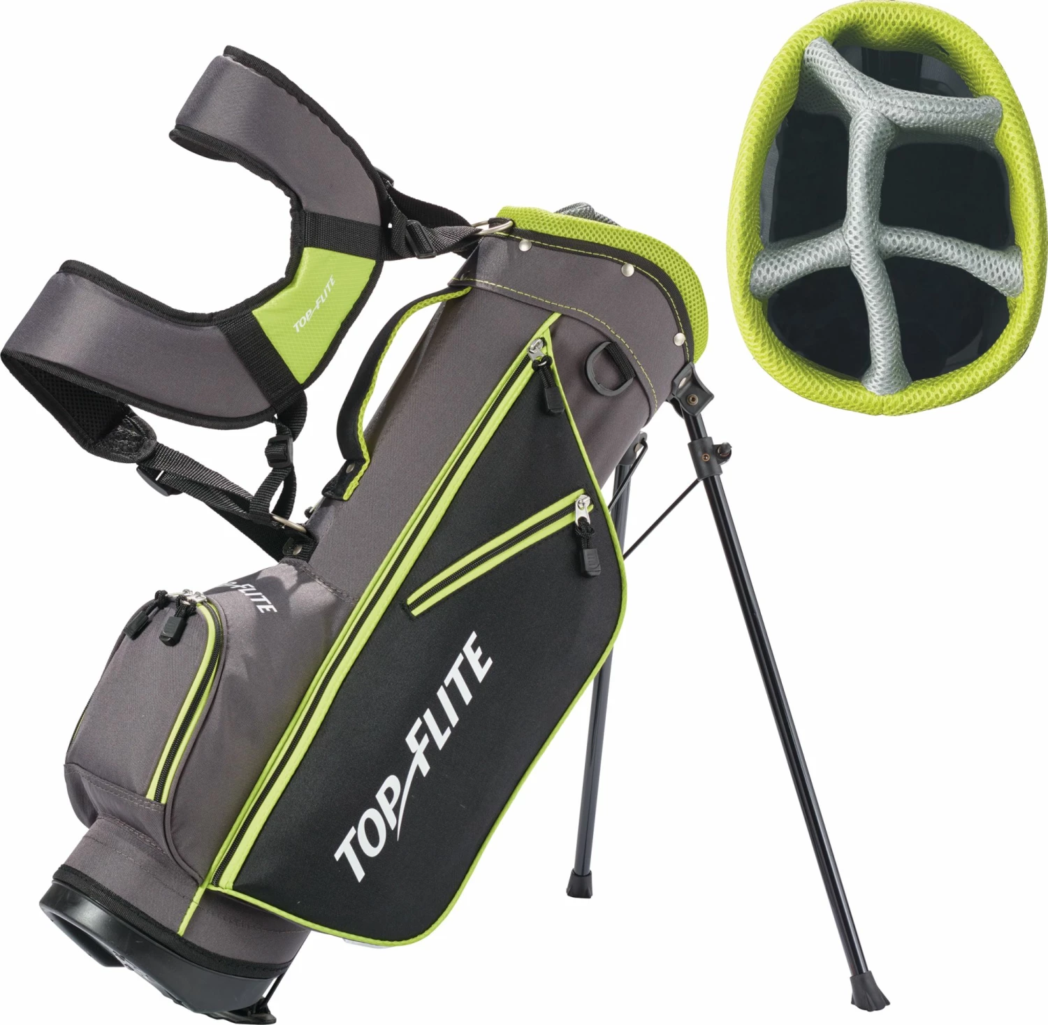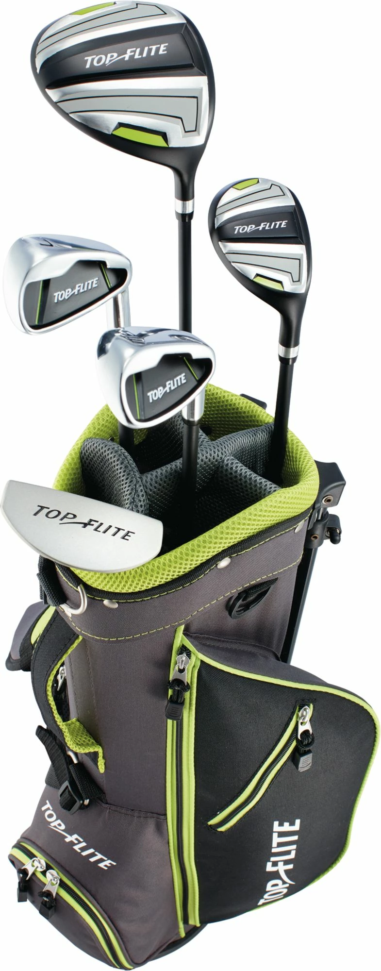 Prepare your golfer for the first tee with the Top Flite Kids’ Complete Set. Designed for golfers ages 5-9 and height 46″ – 52″, this set includes an aerodynamic driver and hybrid, both with low CG, for optimized launch and distance. A wide sole 7 iron and Sand Wedge both feature perimeter weighting for greater playability. A mallet putter and deluxe stand bag add functional quality to the Top Flite Kids’ Complete Set.